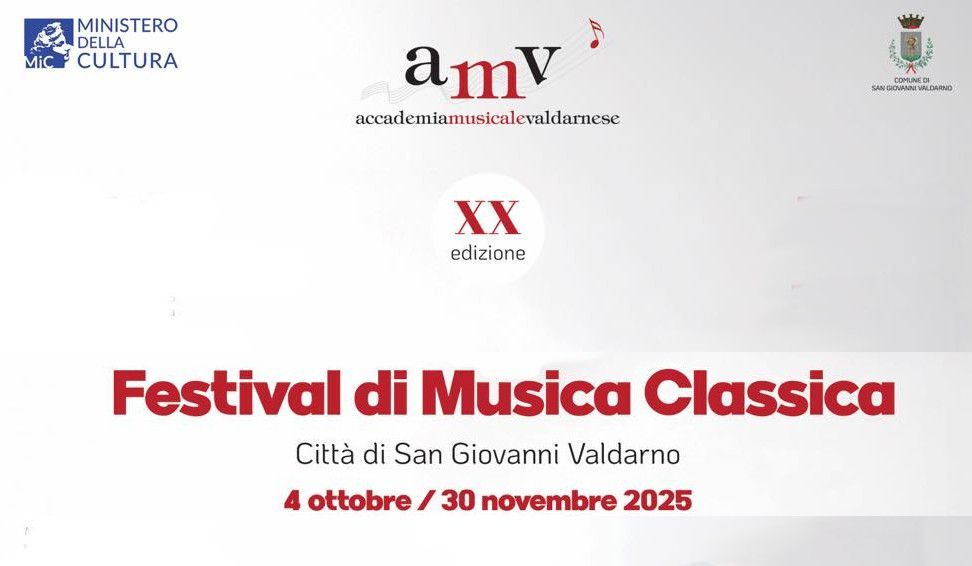 Dal 4 ottobre il via al Festival di Musica classica Città di San Giovanni Valdarno 2025; una serie di ppuntamenti musicali fino al 30 Novembre 2025; un viaggio senza tempo immersi nella bellezza della musica con la XX edizione del Festival di Musica classica Città di San Giovanni Valdarno.